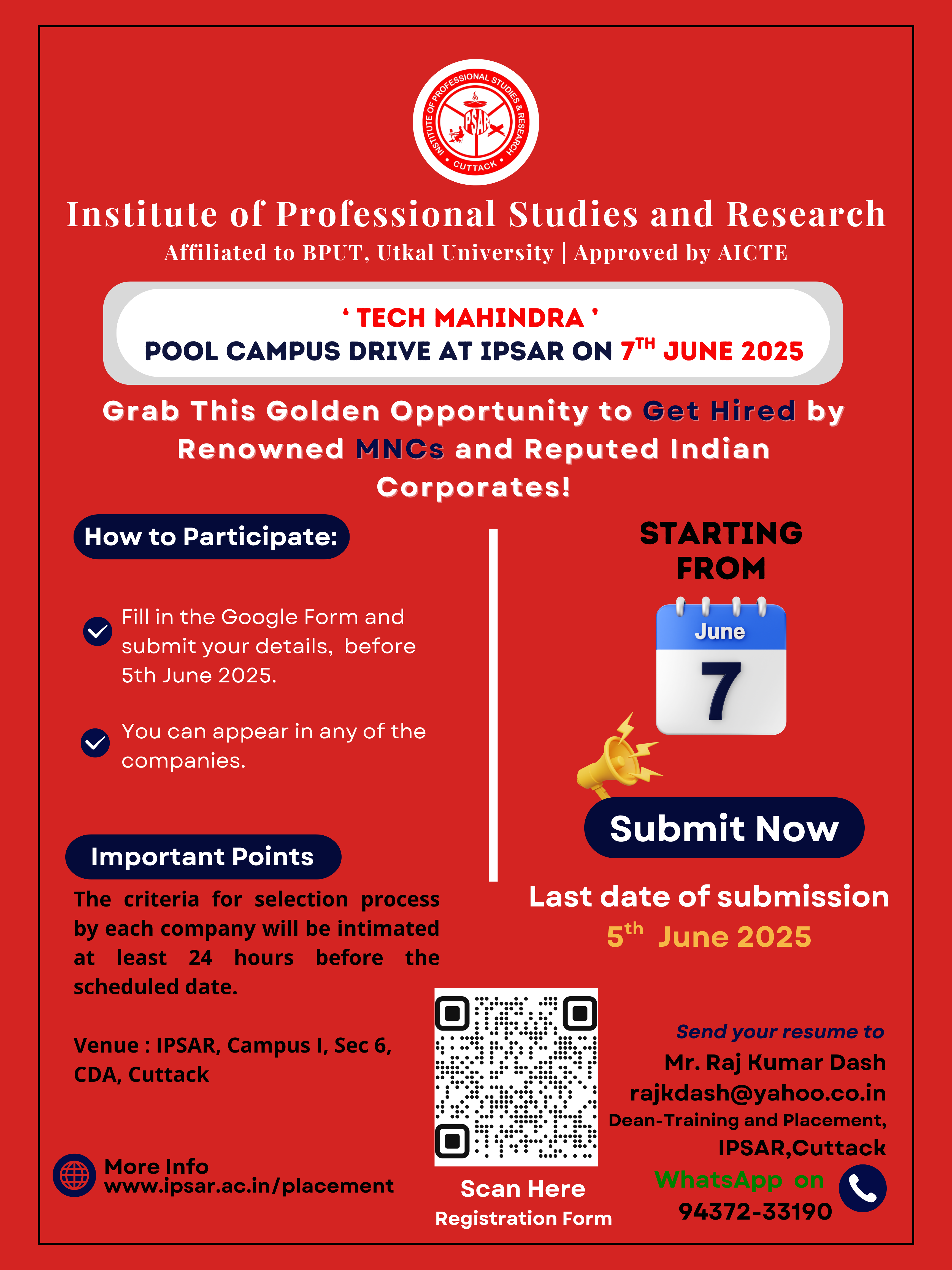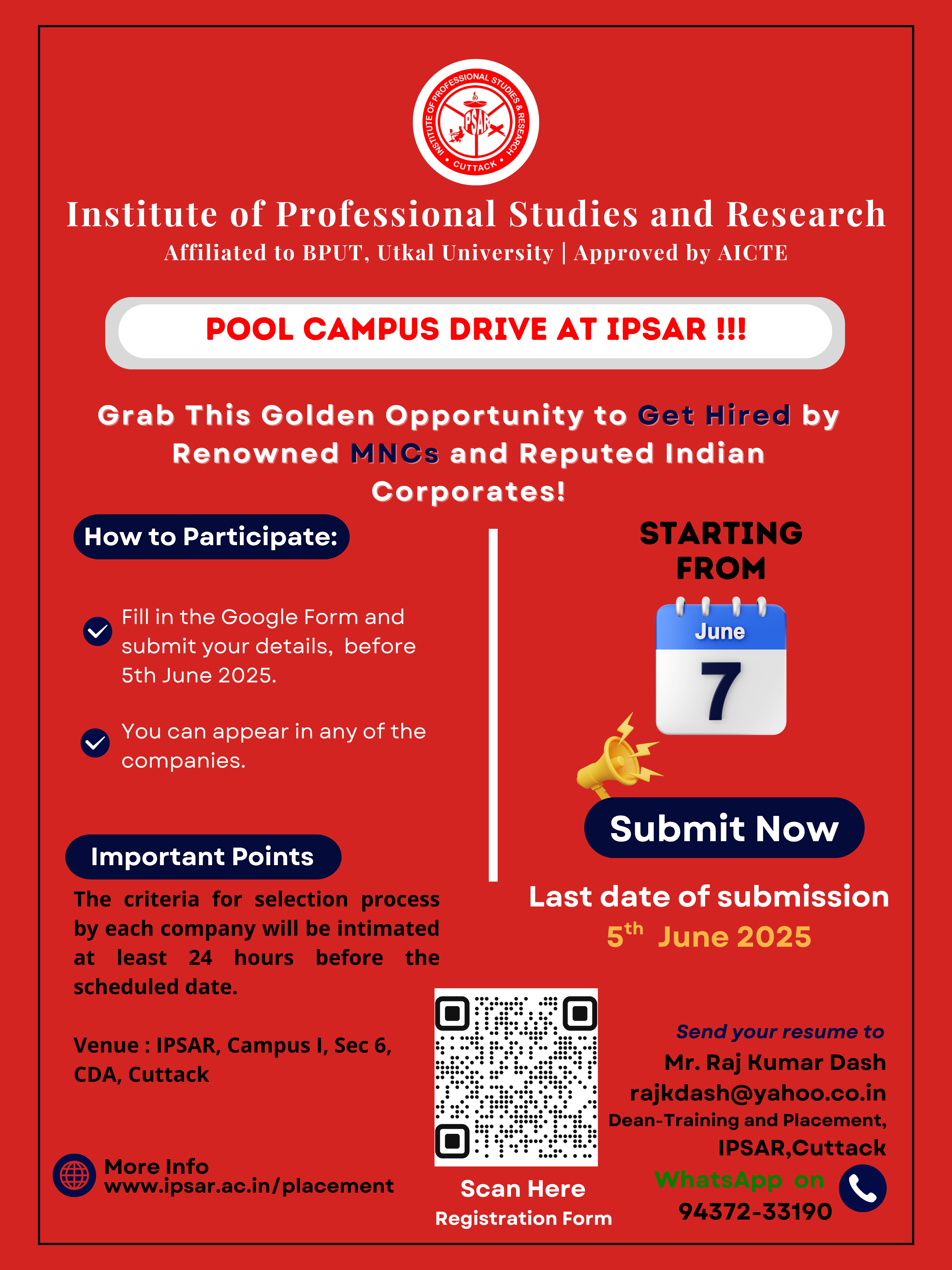 At IPSAR, the syllabus for each program is carefully designed in accordance with the guidelines set by BPUT, Rourkela and regulatory bodies like AICTE and UGC. The curriculum is dynamic, industry-relevant, and updated periodically to incorporate emerging trends, technologies, and best practices. It includes a balanced mix of theoretical concepts, practical applications, case studies, projects, and internships to ensure holistic development of students. The academic structure encourages innovation, analytical thinking, and problem-solving skills, preparing students for professional excellence and lifelong learning.